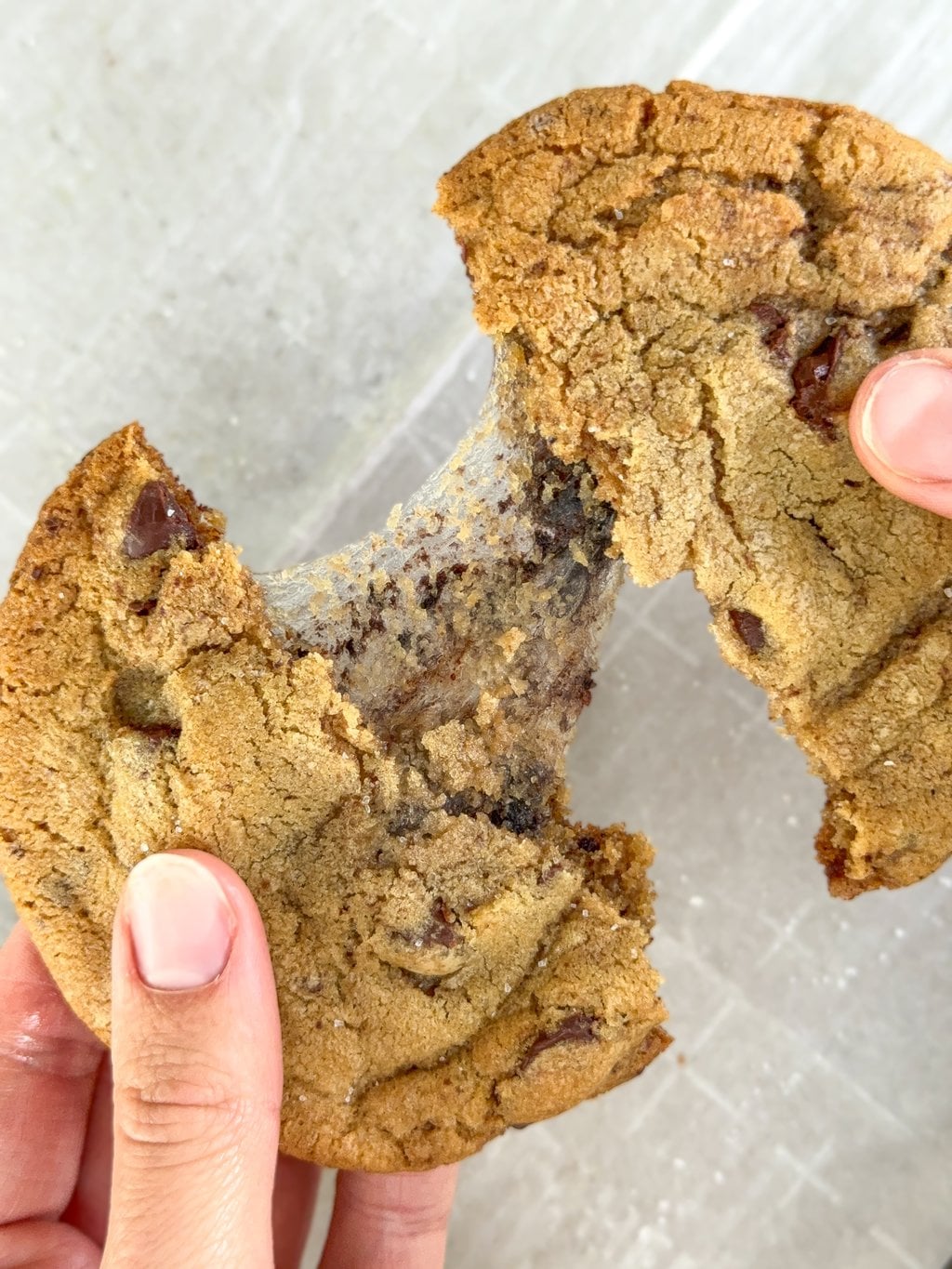 Add crumbled Goodie Girl cookies and a small ball of mochi in between 2 pieces of cookie dough. Seal the edges, then roll into a ball and place on the baking sheet.